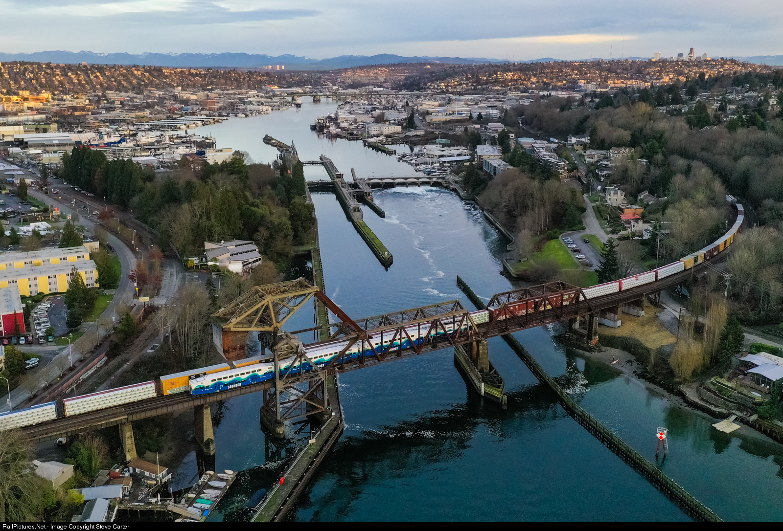 Sounder Train 1700 led by cab car SDRX 109, heads north across the Bridge of Many Names, while a southbound BNSF manifest makes its way to the Seattle Terminal and ultimately Vancouver WA. The Bascule bridge, officially known by BNSF as Bridge 6.3, is on a short list to be replaced with a vertical lift bridge. It also goes by the name of Salmon Bay bridge for the water way it crosses. Just beyond is the Ballard Locks (Hiram M. Chittenden) and the Lake Washington Ship Canal. Off in the distance are the tall buildings of downtown Seattle, with the Cascade mountains finishing the scene.