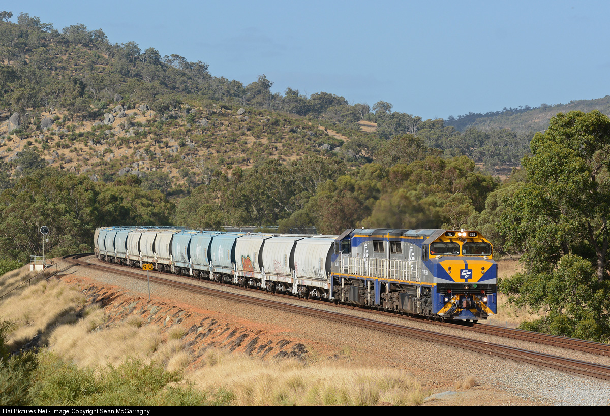 | On hire to Watco WA Rail due to an expected record harvest in Western Australia, VL361 & VL357 from CFCLA and a rake of grain hoppers leased from Graincorp in NSW, work 5S56 loaded grain through Brigadoon to Kwinana CBH. The train loaded at Kellerberrin earlier that day. |