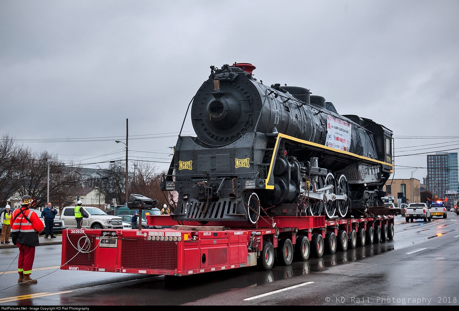 The heavy duty Mammoet owned remote controlled flat bed is being put to the test as it's tow 200+ tons of history down the middle of Charlotte Ave. The special escort is made up of of Nashville Police, members of the Nashville Steam Preservation Society, and various of other contractors. Nashville, Chattanooga & St. Louis Railway 576 J-3 type 4-8-4 "Dixie" is halfway to it's destination for the RJ Corman's Nashville & Western Railway near the Watkins Park Suburbs of Nashville, TN, and it's not every day people would catch a steam locomotive rolling down the middle of the main road. It was a long time coming especially to those who've been fighting "tooth, and nail" both past and present to get the only example of the NC&StL steam out of it's home in Centennial Park and moved to a location to where the locomotive could be save from the elements, to be preserved. Today is that day, a major hurdle has been jump as the locomotive had departed it's home for more than 66 years, and is heading into a bright future. 2019 is the continuing of chapter for 21th century steam in the southeast.