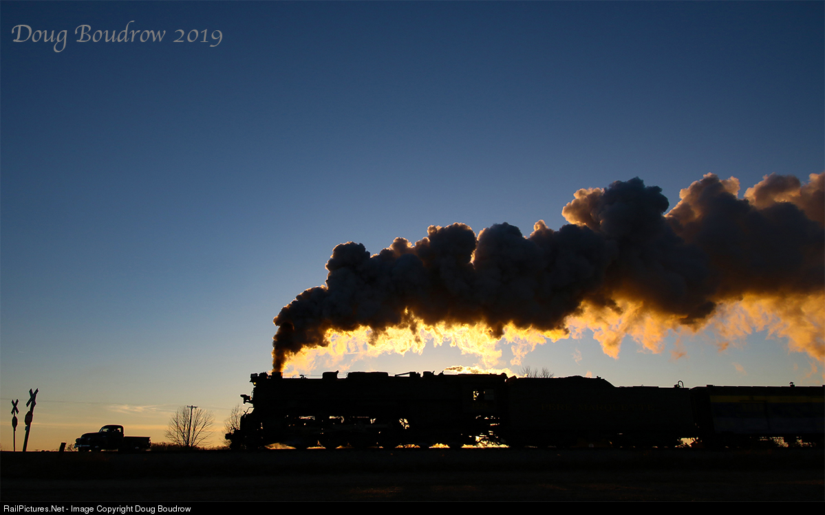 Pere Marquette #1225 was built in 1941 by the Lima Locomotive Works in Lima, Ohio. This locomotive was the very same engine that the Polar Express movie locomotive was based on. Today the locomotive is owned and operated by the Steam Railroading Institute in Owosso, Michigan. In January 2019 Pete Lerro ran a photo charter with 1225 and a matching passenger consist. On the second day of the charter, the locomotive was turned to face South in what turned out to be beautiful sunlight. As the last of the sunlight faded, everyone set up for a backlit shot at sunset. This was the final scene of the event, and absolutely one of my favorites.