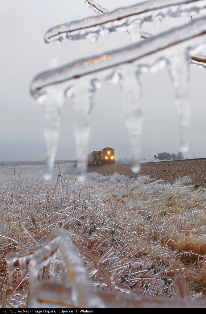 A westbound autorack train creeps along as it battles the grade just outside Cedar Gap on a cold winter morning. After small amounts of freezing rain have built up over the night and the previous day, a thick layer of ice hangs off the grass and bushes leaving everything with a beautiful glaze of white.