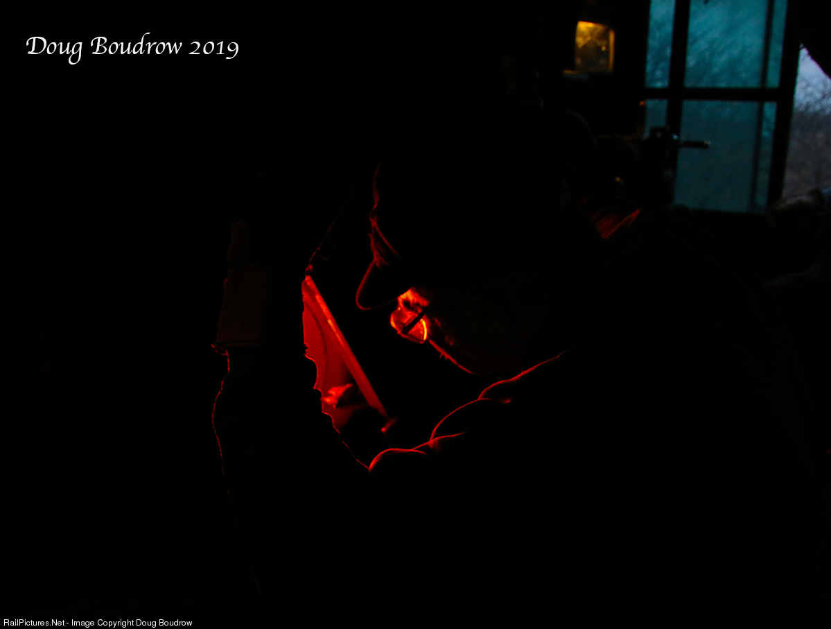 | The fireman of locomotive 1225 checks the firebox during an evening photo charter. Pere Marquette #1225 was built in 1941 by the Lima Locomotive Works in Lima, Ohio. This locomotive was the very same engine that the Polar Express book and movie location was based on. Today the locomotive is owned and operated by the Steam Railroading Institute in Owosso, Michigan. In January 2019 Pete Lerro ran a photo charter with 1225 and a matching passenger consist. One of the most iconic locations on the Steam Railroading Institute's operable track is the Carland Elevator. During the event, multiple run-bys were staged at this location. |
