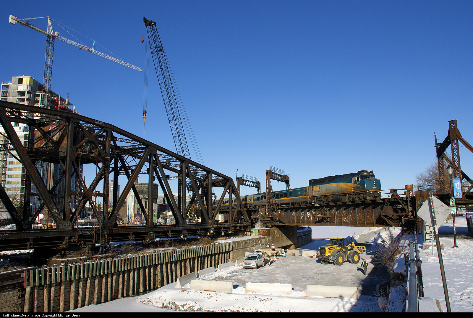 | Preparatory work. Preparatory work for the REM (Réseau express métropolitain) light rail project has begun where it will parallel CN's St-Hyacinthe Sub. Here VIA 67 with VIA 6413 leading crosses the Lachine Canal, with work ongoing underneath. |
