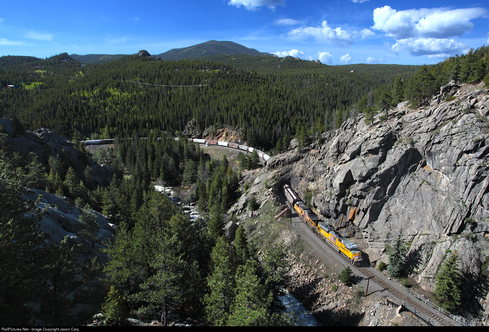 A westbound Potash empty skirts South Boulder Creek. The head-end is exiting the canyon on a tight 10 degree curve, while the cars east of Tunnel 29 round a 12 degree horseshoe. All these curves combined with the 2% compensated grade make this a spectacular piece of railroad. The Moffat Road!!!!