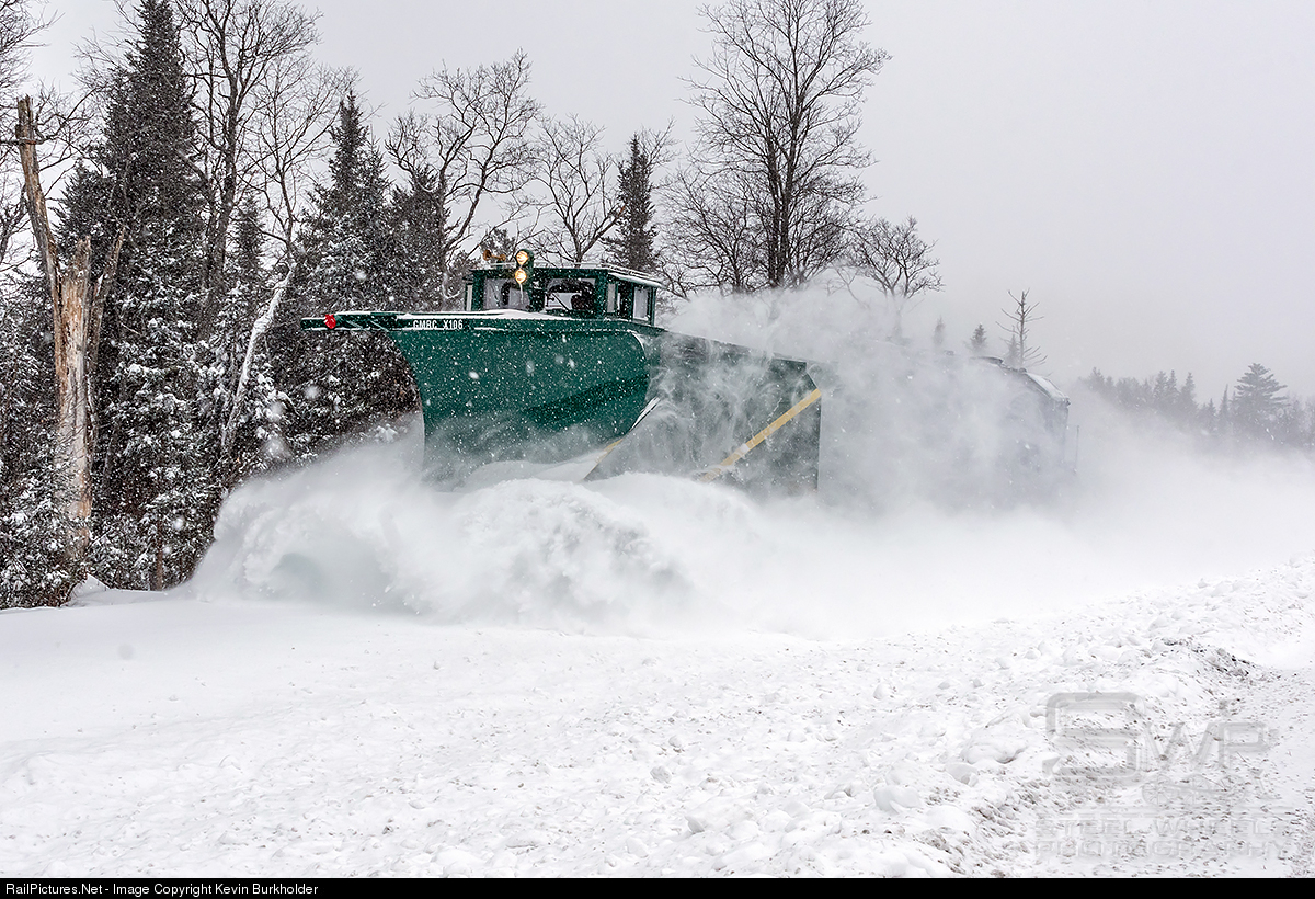 On January 19 and 20, a major winter storm dumped as much as 2 feet of new snow across the Green Mountain Railroad's Bellows Falls Subdivision. Vermont Rail System responded to the storm by dispatching the GMRC Russell Plow, X106, with GMTX GP38-3 2684 shoving from Rutland to Bellows Falls, Vermont. The plow is adjacent to Route 103 in Mt. Holly, Vermont, during its plowing duties.