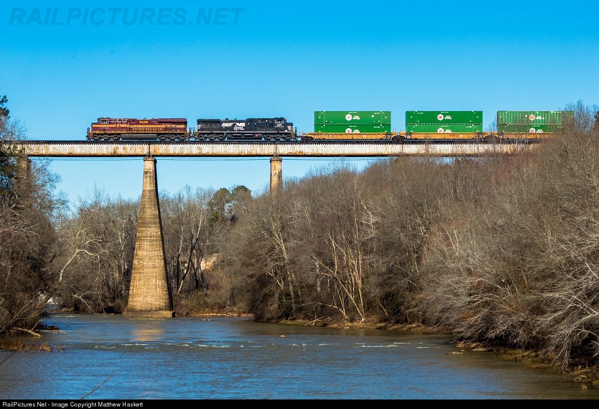 On a very cold but beautiful morning 213 crosses over the Pacolet River in Converse, SC with 8102 the PRR heritage unit leading.