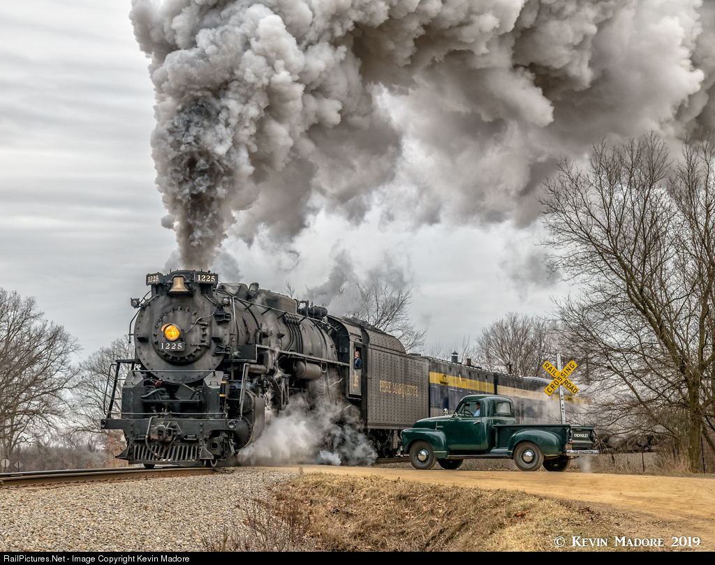 Images from two Lerro Productions events, 10 years apart: 2009 and 2019. The 2009 featured a 31-car freight and NKP 765. The 2019 trip showcased just the 1225 with the Steam Railroading Institute's passenger consist.