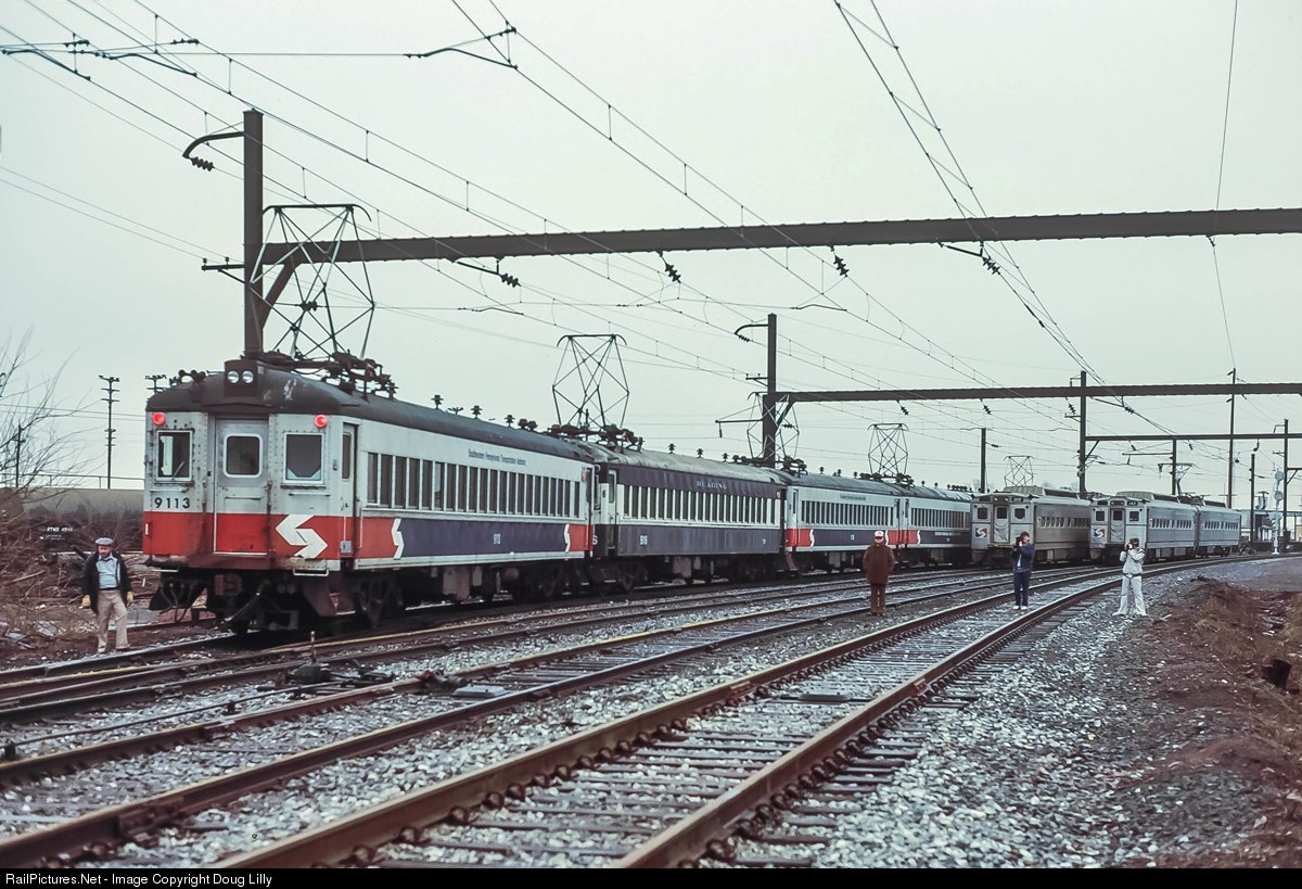 Two generations of the former Reading electrification stand in the holding yard at Lansdale, Pennsylvania. To the left is a five-car Lineup of Blueliner cars, dating to the original electrification of Reading suburban service. Originally built in the early 1930’s, a subset of the original cars were rebuilt in the mid 1960’s and repainted in the blue scheme still seen on the second car. To the right are two pairs if Silverliner IV cars from the mid-70’s, one each of PC and Reading origins.
