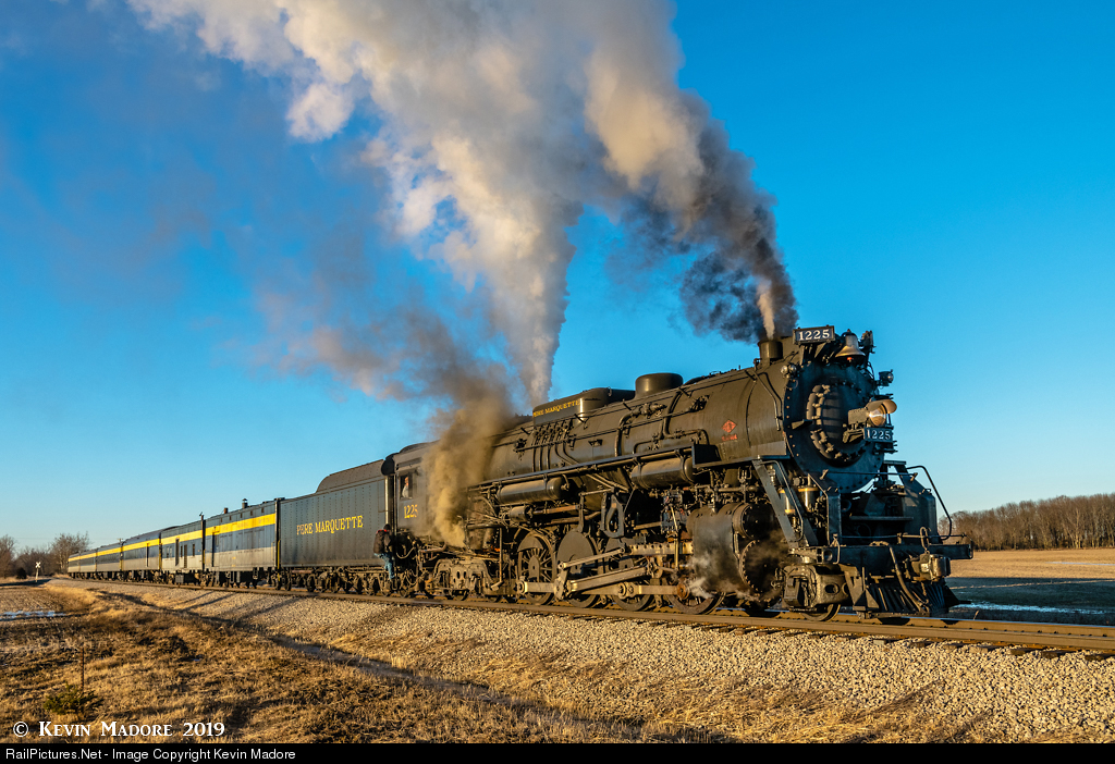 Anybody else smell smoke?? With PM 1225 and her train stopping briefly between run-bys to discharge a cab rider, I decide to take the opportunity to shoot a portrait of her in the golden, pre-sunset light. When I put the camera up to my eye, I noticed something very odd in the form of a very dense, sooty plume emanating from the ash pan area under the firebox and curling up just in front of the cab. This went on for perhaps 10-15 seconds, with just a little fire visible at the forward end of the pan. For a moment, I wondered if the crew was aware of it....and then it dawned on me what was likely happening here. After firing for effect on numerous run-bys in the previous 30 minutes, it is quite likely that the crew had a firebox full of crud that was probably starting to strangle their fire. I think that the plume you see in this photo was likely generated by the Fireman shaking the grates in an effort to drop the loose ash and get the fire breathing again. It's something I see often during morning servicing, but this is the first time I can recall seeing it out on the line, particularly in golden hour light. Sure enough, the plume rapidly went away just seconds later, and the 1225 began backing up to begin a spectacular series of sunset runbys.