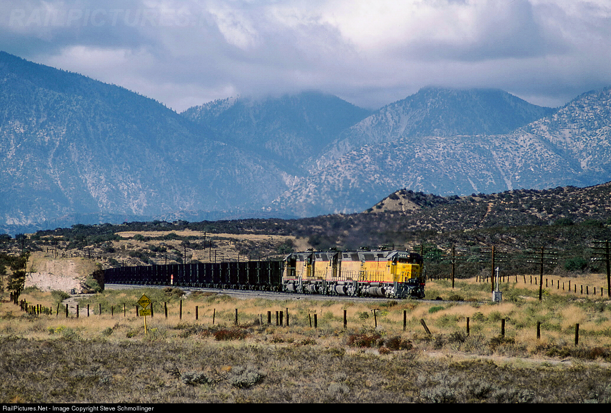 Four UP SD45s roll an empty Kaiser Steel coal train eastward at Martinez on Cajon Pass. The train of high-sided coal hoppers is headed back to the loadout in Utah for another load. The tall and abrupt San Gabriel Mountains dominate the background.