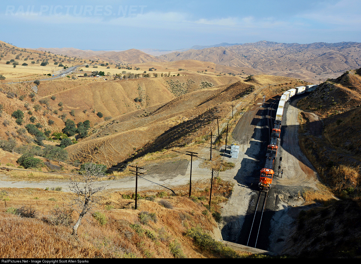 Perched high above tunnel 5 in the lower Tehachapi mountains on a dry spring morning, the view is of a north bound BNSF intermodal, dropping down grade around the curve at the north end of Cliff siding, and is approaching tunnel 5’s south portal(facing north in reality). Seen to the left is Bealville, where this train will pass through in just a few minutes.