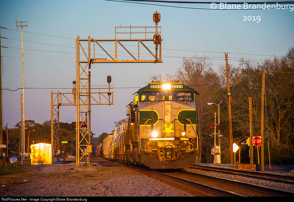 | As the last rays of light start to fade away to the darkness of night, NS 373 blasts through the small town of Gordon GA this evening with the Southern Heritage unit leading under the endangered Southern signals that are soon to be replaced. |