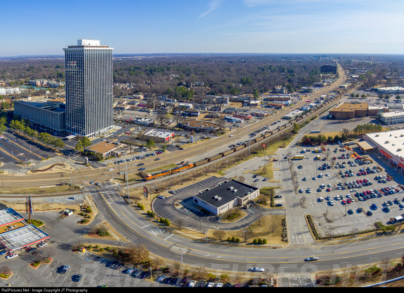 BNSF 8798 rolls west down Poplar Avenue past Clark Tower.