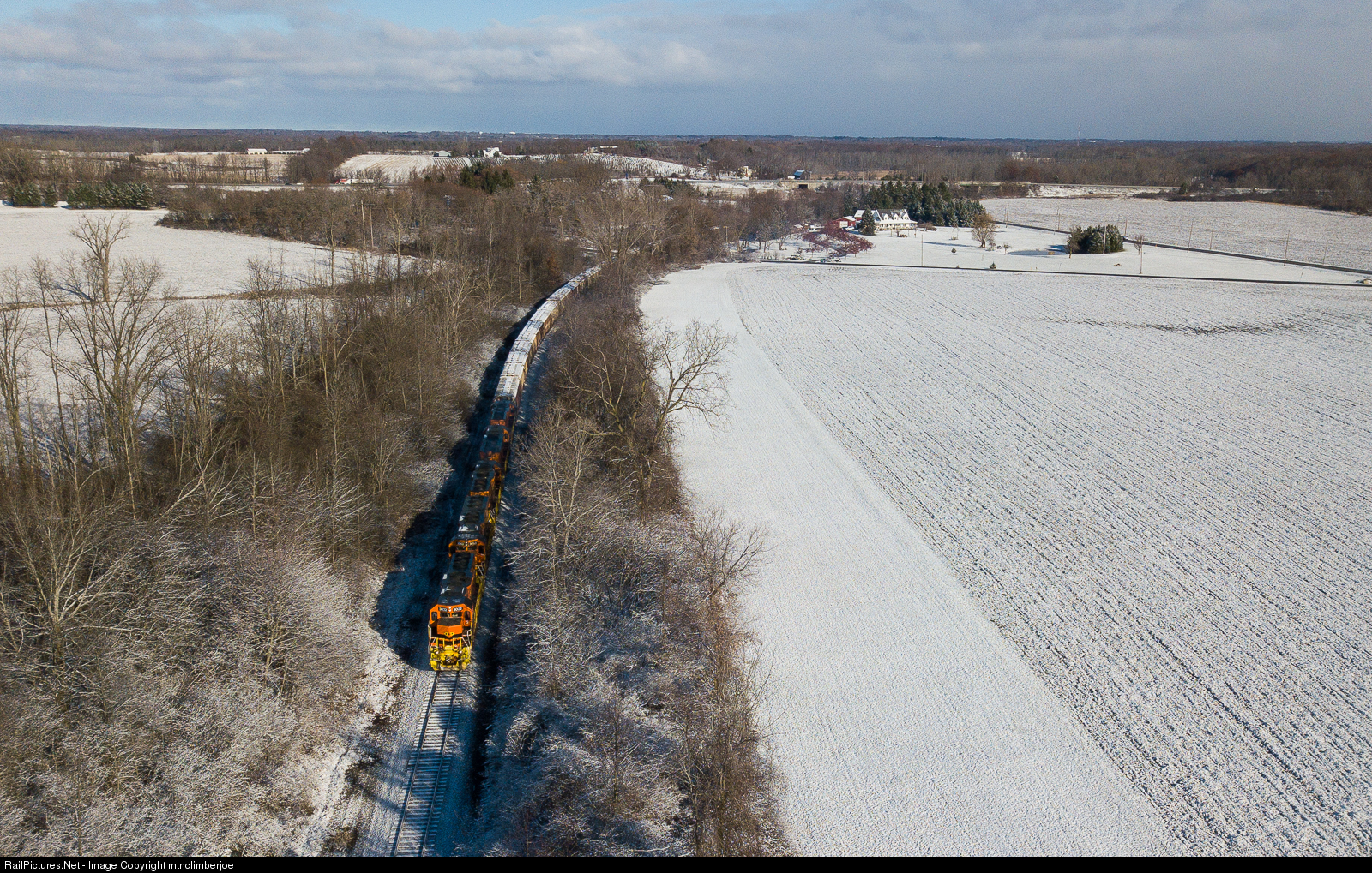 The sun is shining after a night of fresh snow and frosty trees as Rochester & Southern empty salt train GW-1 heads south through New York farmland and approaches the town of Scottsville.