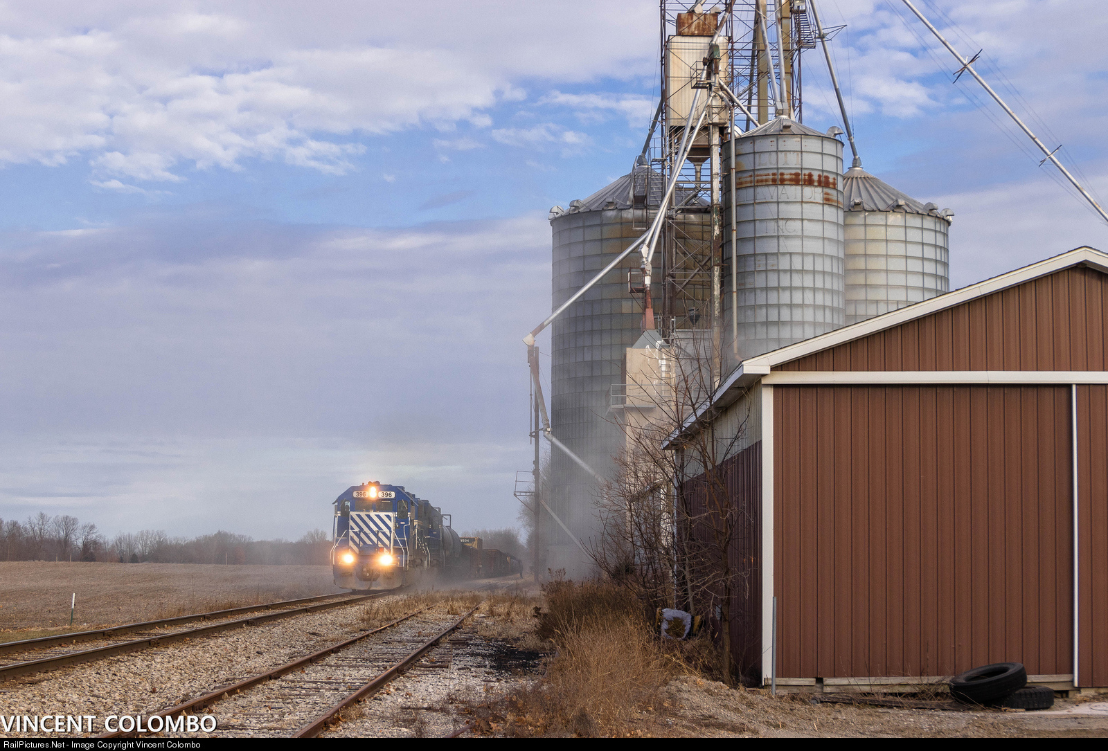 | Great Lakes Central GP38-2s 396 and 395 lead a local southbound through Howell, MI, passing the Lott Elevator. |
