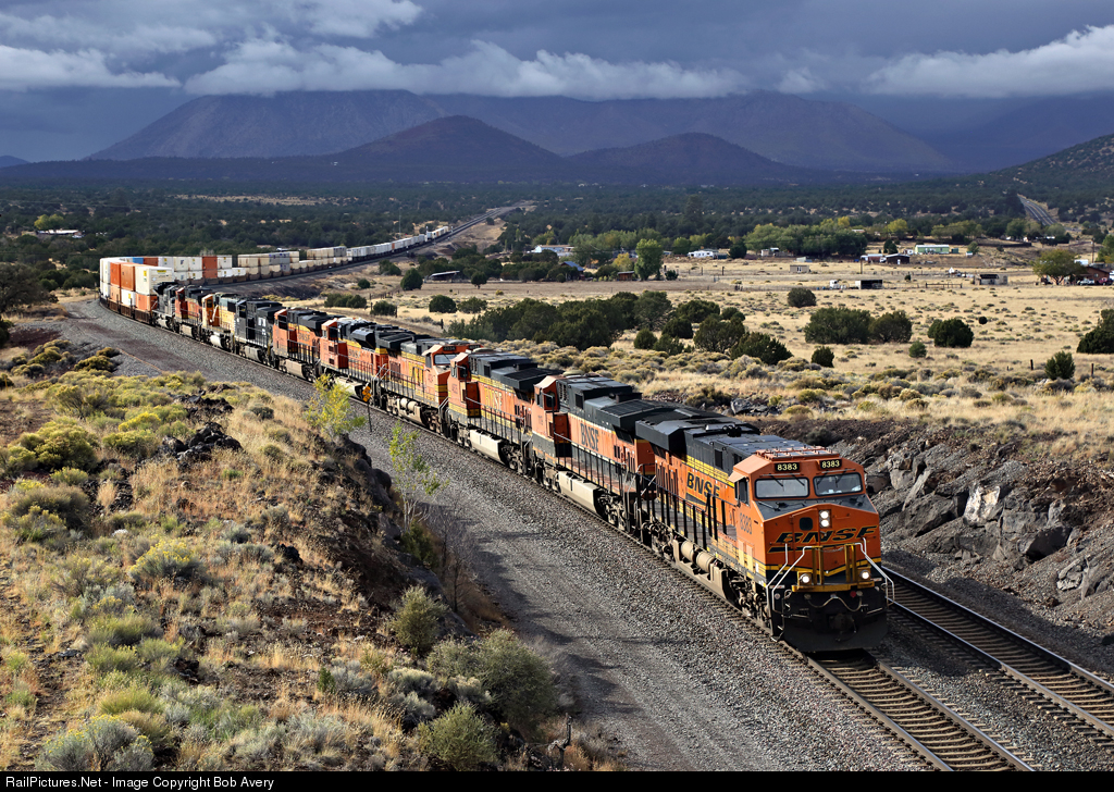 With a storm embracing the distant Kachina Peaks, an eastbound intermodal on BNSF's 'transcon' main line approaches Darling Siding, Winona (east of Flagstaff), Arizona. Of the ten locomotives, six are being conveyed 'dead in train' no doubt to position them for other work.