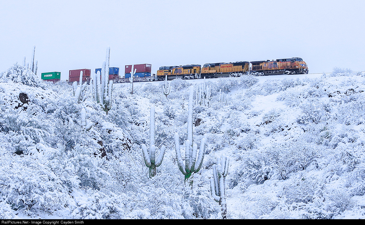 After heavy snowfall in Southern Arizona a WB UP stack train glides downgrade toward Tucson.