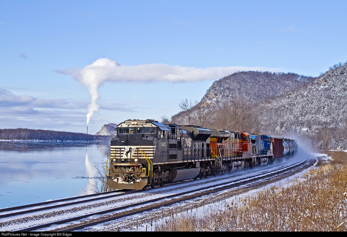| NS 1140 leads a colorful consist southeast on a loaded oil train along BNSF's mainline just north of Victory, WI. The Dairyland Power Coop stack is visible in the background at Genoa. |