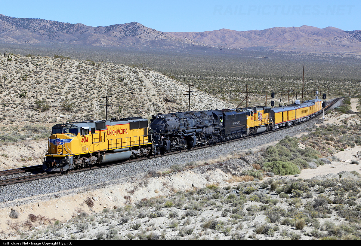 Flanked by EMD SD70Ms 4014 and 4884 Union Pacific Big Boy 4014 has nearly reached the summit of Cima Hill in Southern California's Mojave Desert. The Big Boy hospital train was on the Yermo to Las Vegas leg of its multi-day trip 'home' to Cheyenne, where Big Boy 4014 is being restored to service by the steam crew.