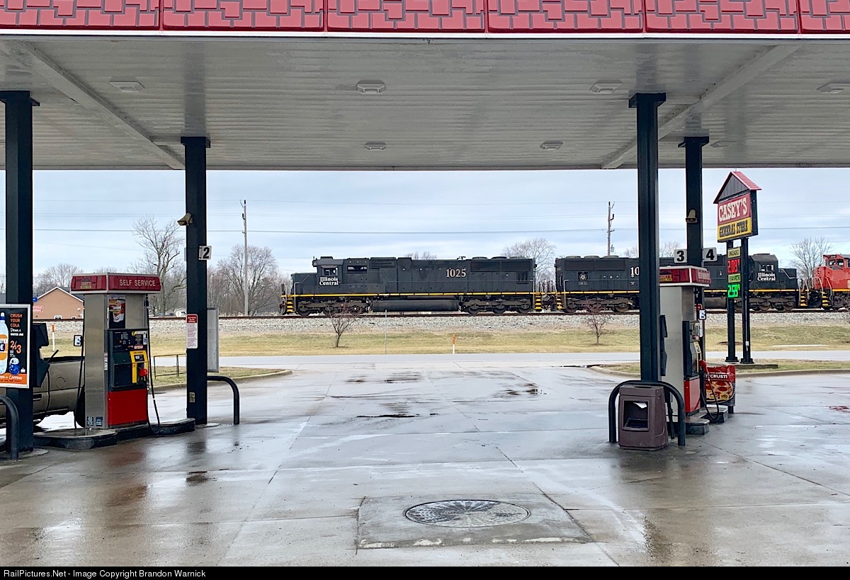 | “Stopping for snacks” IC 1025 sits across from the Neoga Illinois Casey’s General Store, as they wait for a northbound train to pull into the siding. |