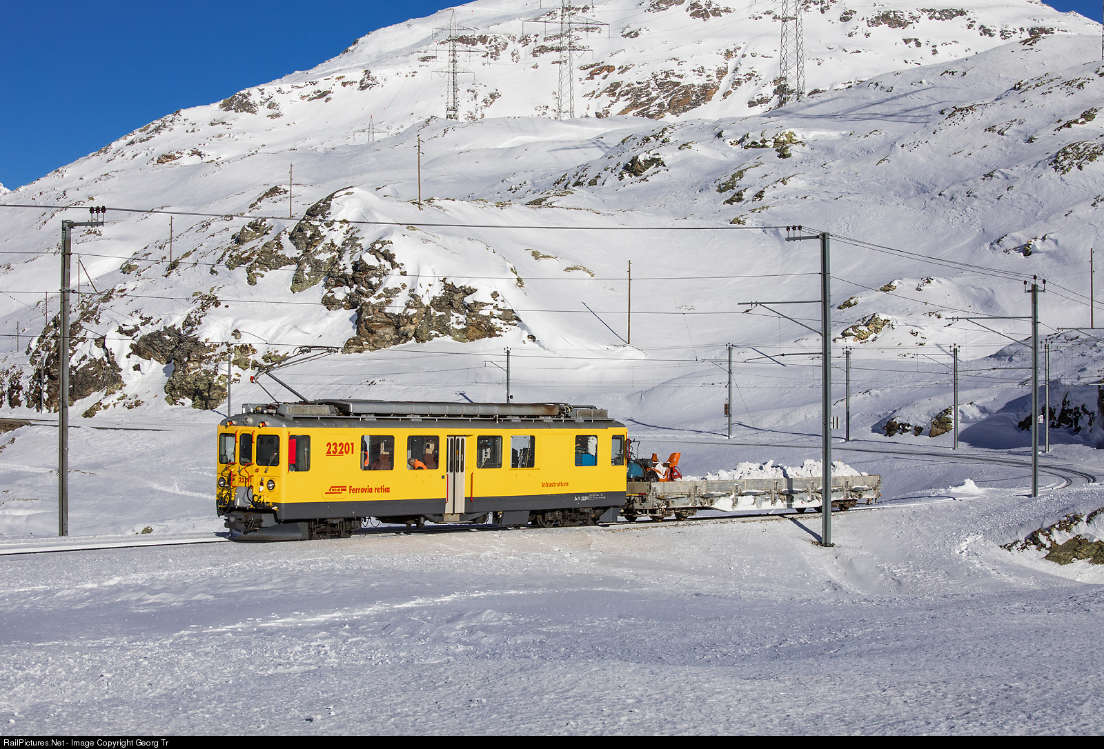 | Railcar Xe 4/4 # 23201 of the infrastructure with flat car Xae-t # 93105, running south of Ospizio Bernina station along the Lago Bianco. The snow on the flat car is transported into a gallery where it is placed laterally to prevent or minimize ice formation. The railcar was rebuilt from passenger railcar ABe 4/4 # 48 in 2012. |