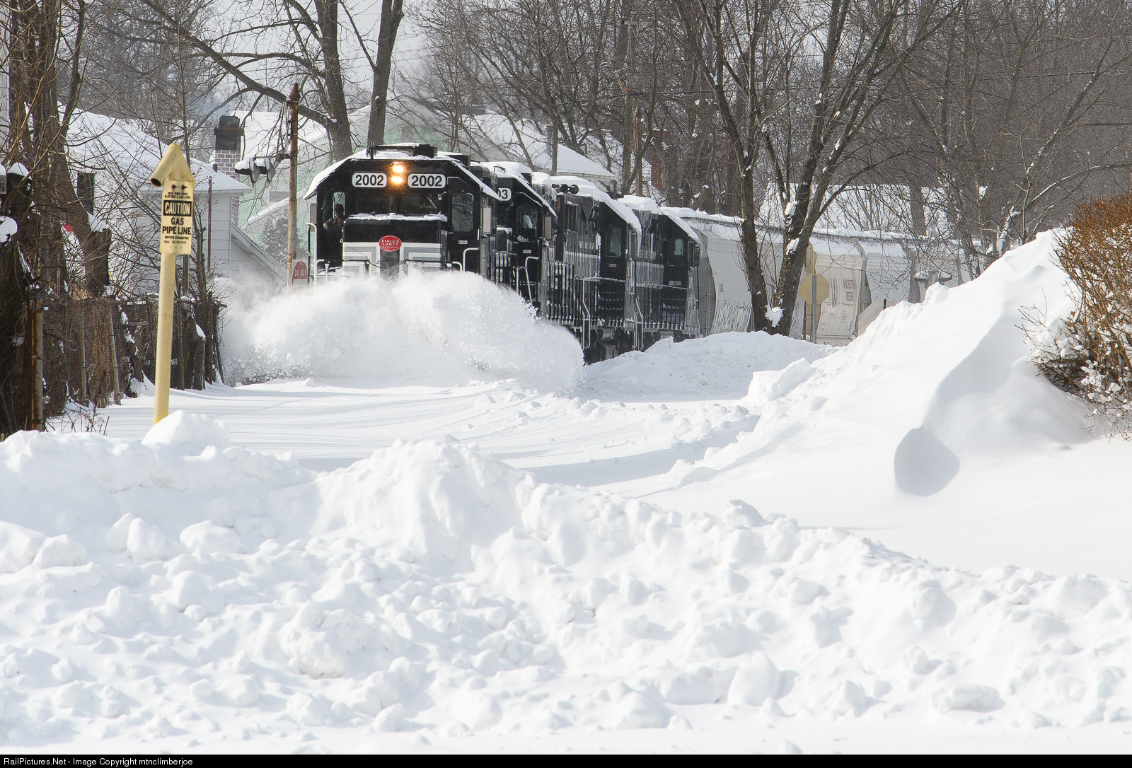 The Finger Lakes Railway GS-2 blows through drifted snow as they make their way east towards Syracuse through the town of Seneca Falls, New York with a quartet of GP38-2's working hard.