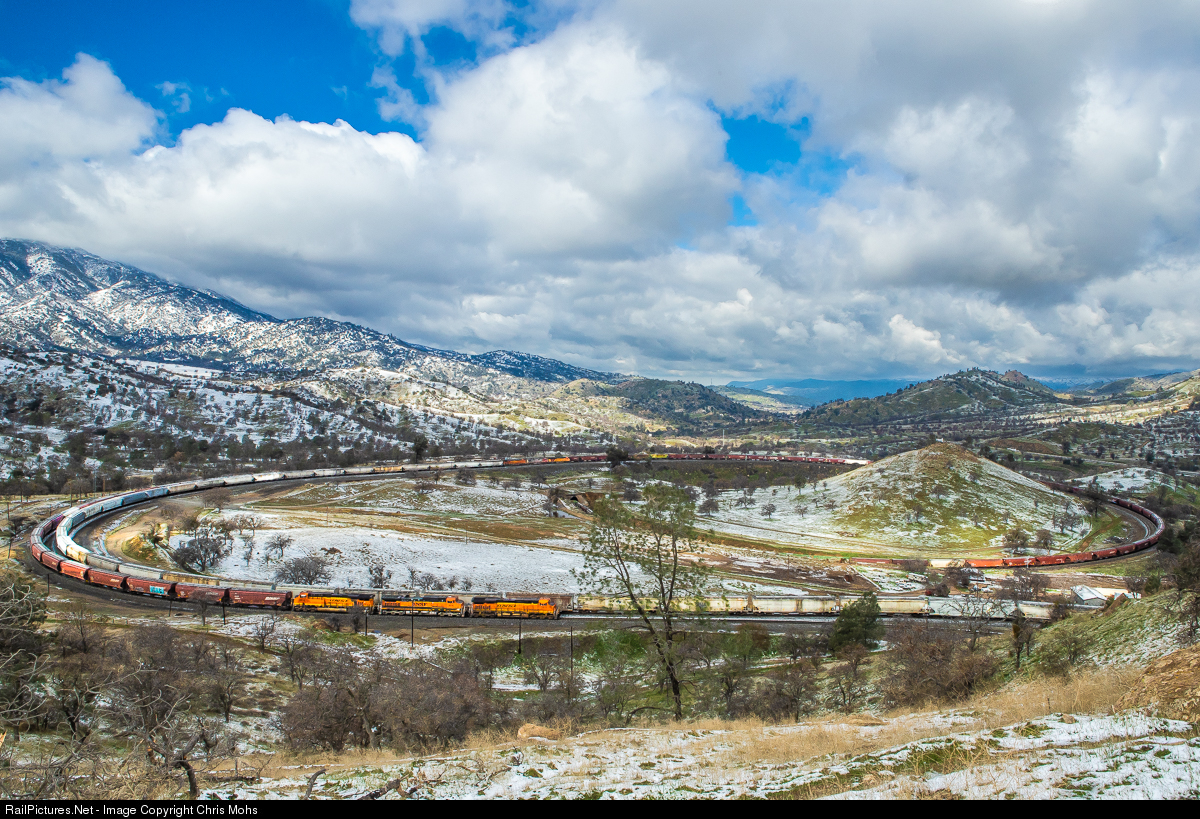 | A cold storm out of the northwest and a snow level down to 2000 ft brought a dusting of snow yesterday and overnight to Tehachapi Pass. A southbound in the foreground and a northbound on the far side meet on the famed Tehachapi Loop. |