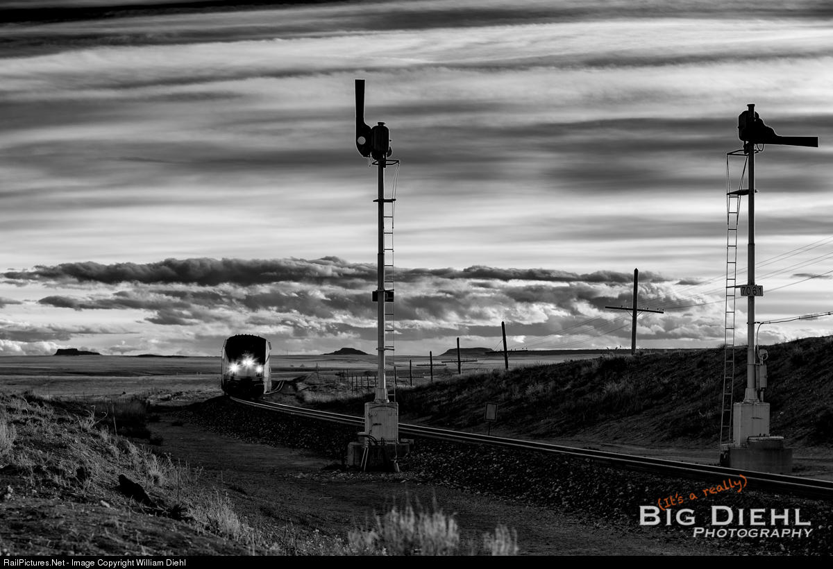 Decelerating into a temporary speed restriction, Amtrak #4 catches the final rays of sunshine at the pair of semaphores at MP 706, the furthest east of the remaining ones. |