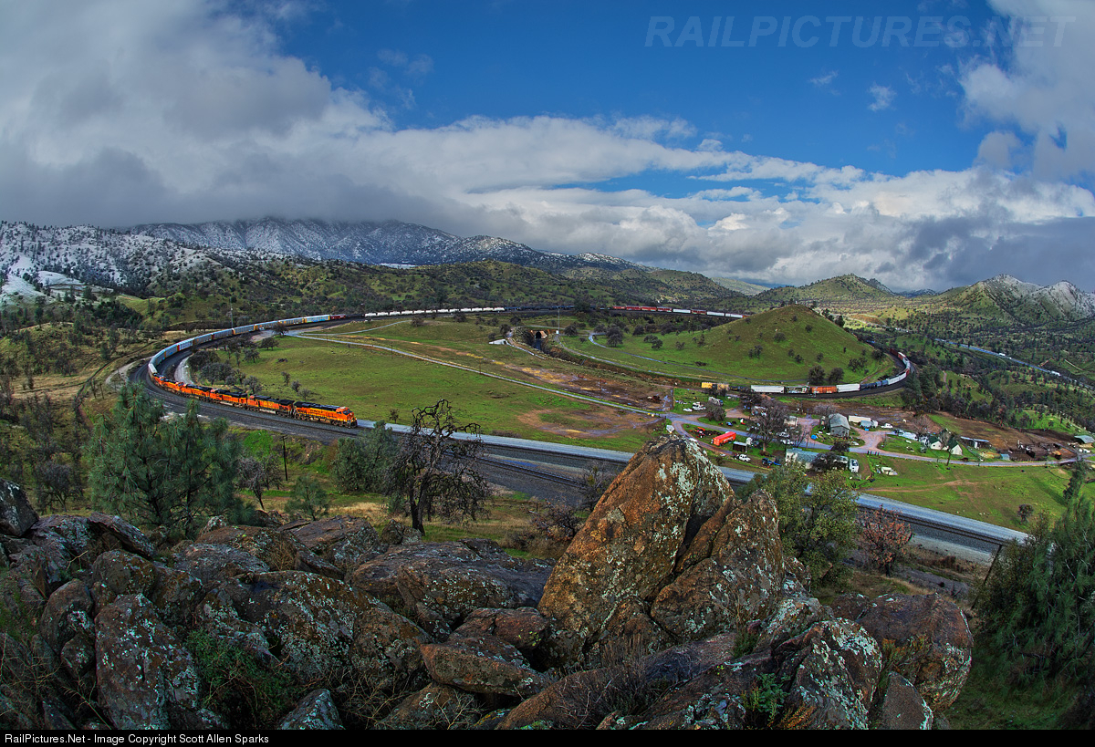On a frosty, winter morning at the Tehachapi Loop, a BNSF manifest has it’s turn at the railroad landmark, climbing the grade toward the town of Tehachapi. A winter storm had quickly broke apart just moments before the train entered tunnel 9, revealing a snow covered Bear Mountain in the background with the snow level just above the hill I was standing on. It’s a perfect spot to watch trains.