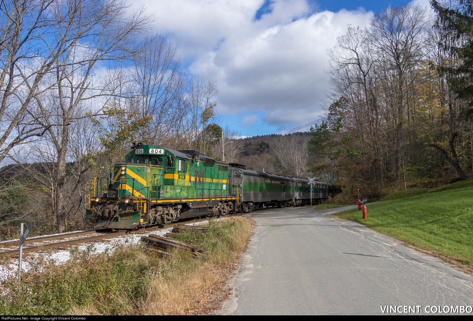 The Green Mountain Fall Foliage Train crosses Cavendish Gulf Road in Cavendish, VT. Leading the train is GMRC 804, a GP9r and a former Norfolk and Western unit.