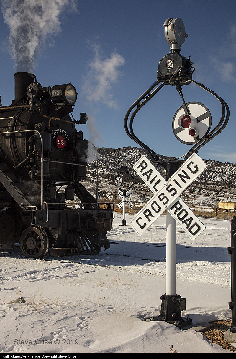 Nevada Northern Railway locomotive # 93 passes two of the historic Western Railroad Supply wig wag crossing signals. Steve Crise Photo © 2019 (file # SJC_NNRY_0280139)