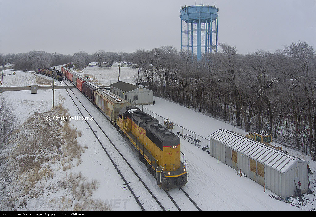 Once the Chicago Great Western mainline from Oelwein to Kansas City, the UP keeps this Job 7 local here at Waterloo to work the 6 miles left the UP still owns between the Cedar River Bridge in downtown Waterloo and Dewar. The UP is land locked here, so IANR handles the UP traffic out of Waterloo to Cedar Rapids or Manly to give it back to the UP. The railroad east of Dewar is owned by Transco Railcar and operates as the D&W Railroad to Oelwein still.