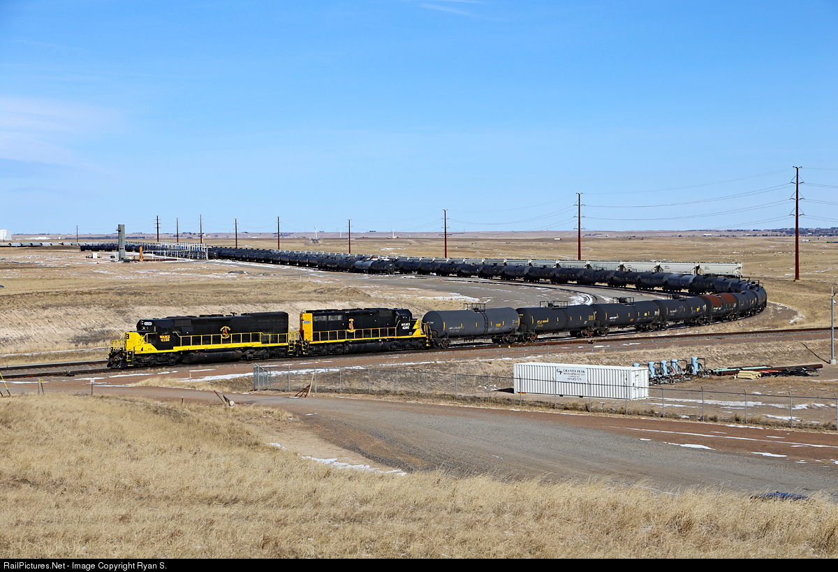 | Dressed in parent company Watco's sharp black & yellow scheme, Swan Ranch Railroad EMDs 4155 (ex-D&RGW SD40T-2 5395) and 4200 (ex-KCS SD40 625) switch a cut of tank cars inside the Swan Ranch Industrial Complex. SRRR switches the many industries within the complex and interchanges with both Union Pacific and BNSF. |