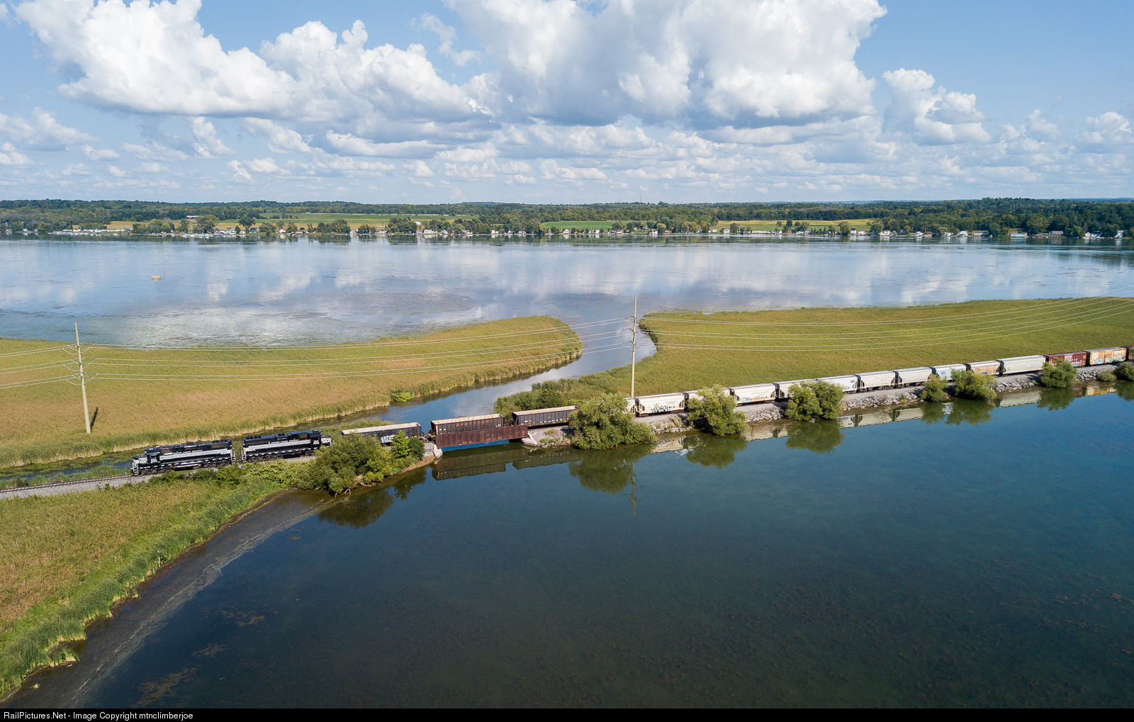 A pair of GP38-2's lead the return leg of the Finger Lakes Railway GS-2 as they cross the causeway over Cayuga Lake and head west towards Geneva.