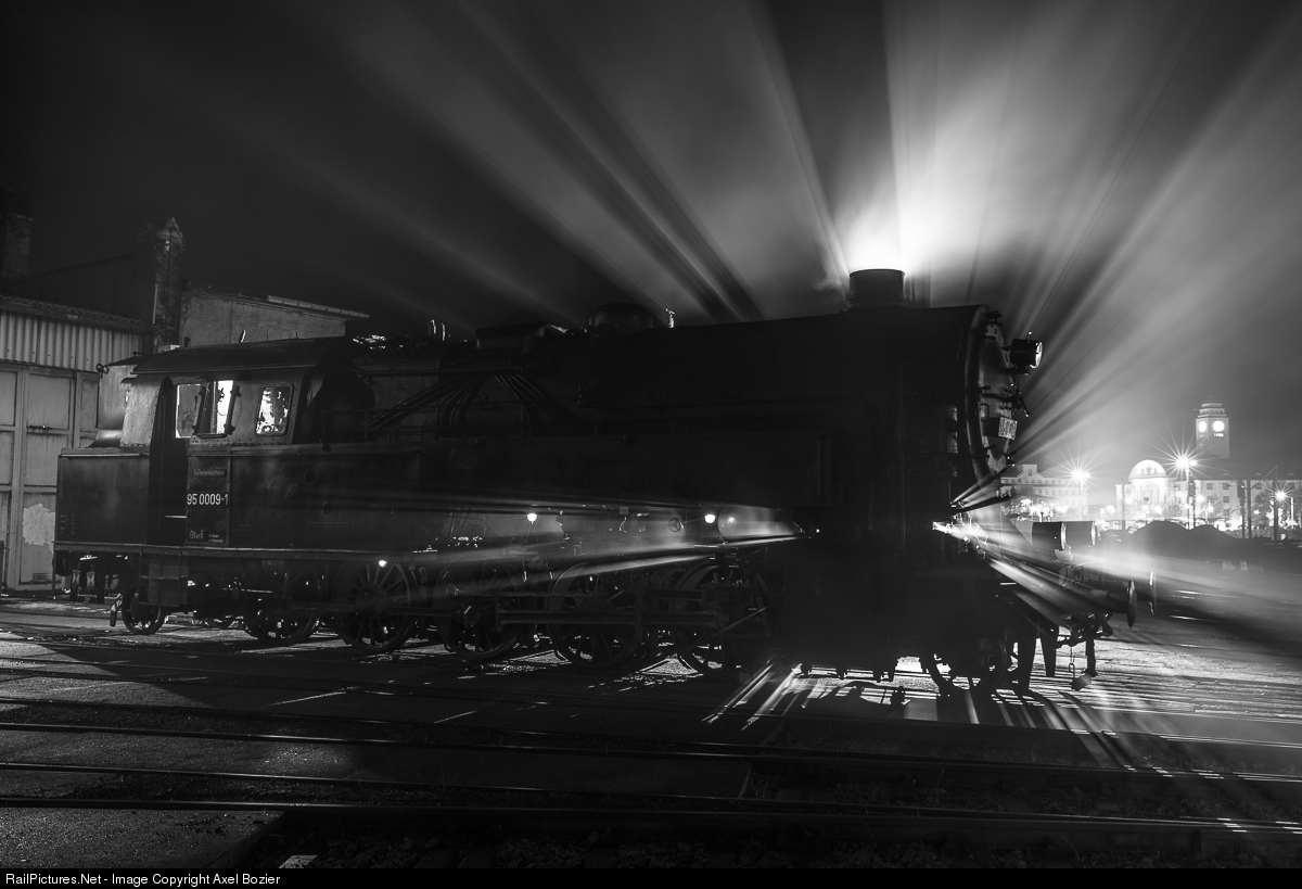 | Deutsche Reichsbahn 2-10-2T Class 95 Steam Locomotive #95 0009-1 built by Lokomotivfabrik Borsig in Berlin in 1922 is seen in front of the locomotive depot of Sonneberg. This locomotive was designed to haul heavy freight trains on lines with steep grades. |