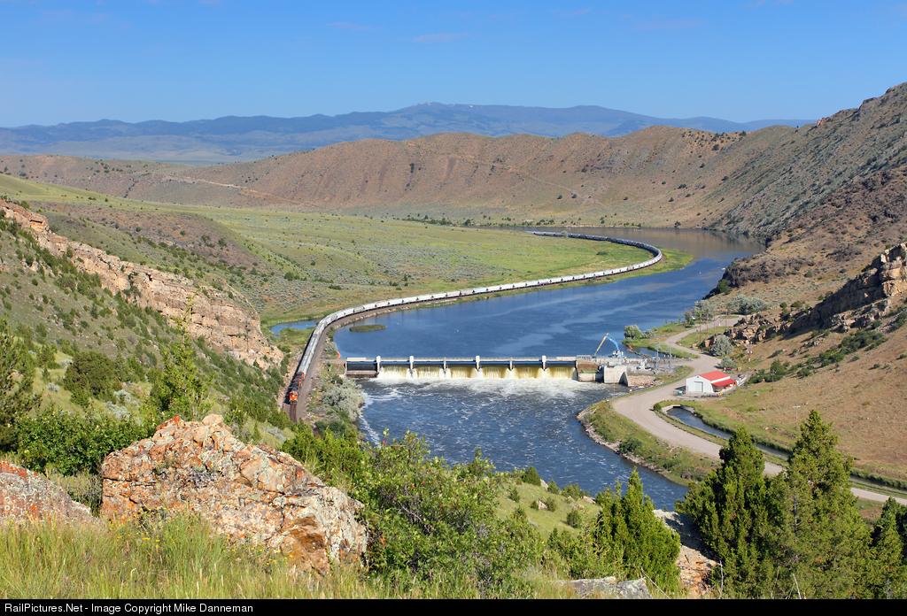 Water is running a bit high and roars over Toston Dam in Lombard Canyon as a westbound BNSF grain train passes by on Montana Rail Link’s Second Subdivision on the morning of July 6, 2018.