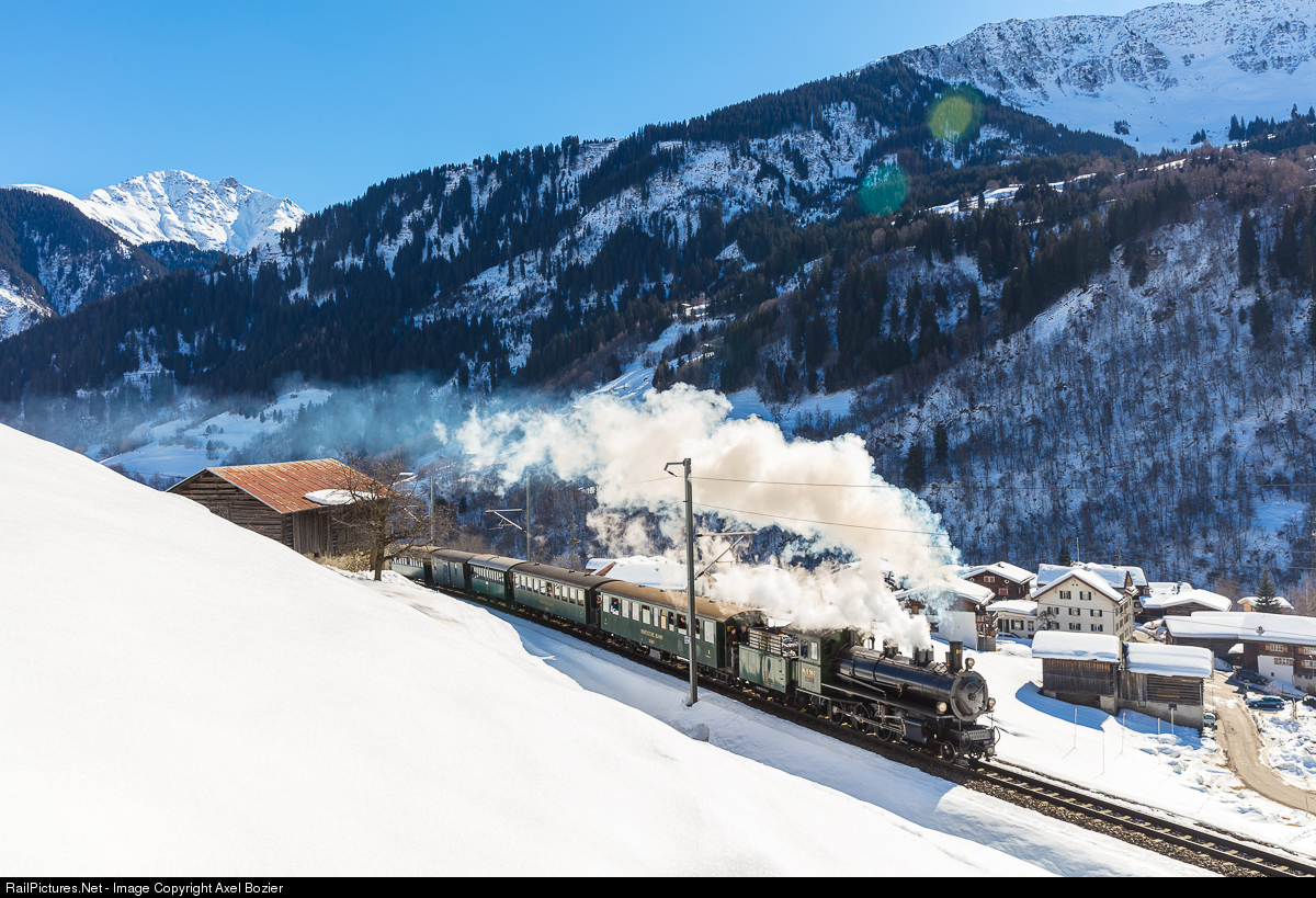 | "Consolidation" 2-8-0 steam locomotive G 4/5 #107 "Albula" (built by SLM in 1906) of the Rhaetian Railway RhB with a special train "winter steam journey in the Surselva" is climbing the steep grade out of Sumvitg-Cumpadials, heading to Disentis. |