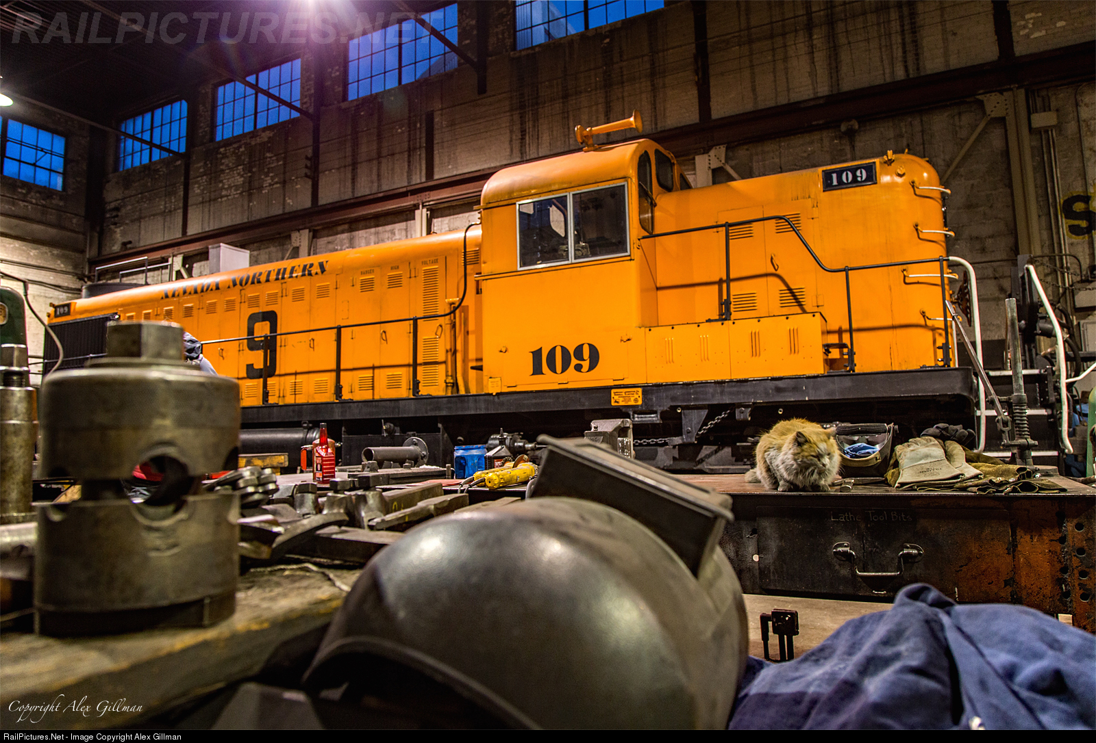 "Dirt" Watches Over the Shop. Nevada Northern Railway's famous mascot, "Dirt" the cat, enjoys the warm confirms of the engine house this morning as the railroad's pair of steam locomotives warm up on the other side of the shop. While steam might be filling the other half of the steam-era structure, Dirt has elected to sit with one of the railroad's Alco RS-2's this morning.