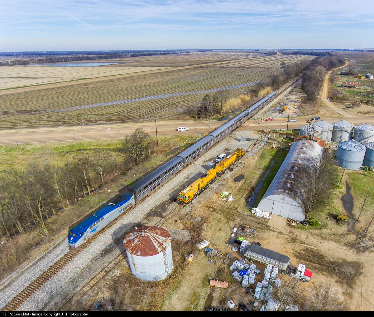 | The southbound City of New Orleans flies past Loram (LMIX) 612 as it goes through the small community of Banks, MS. |