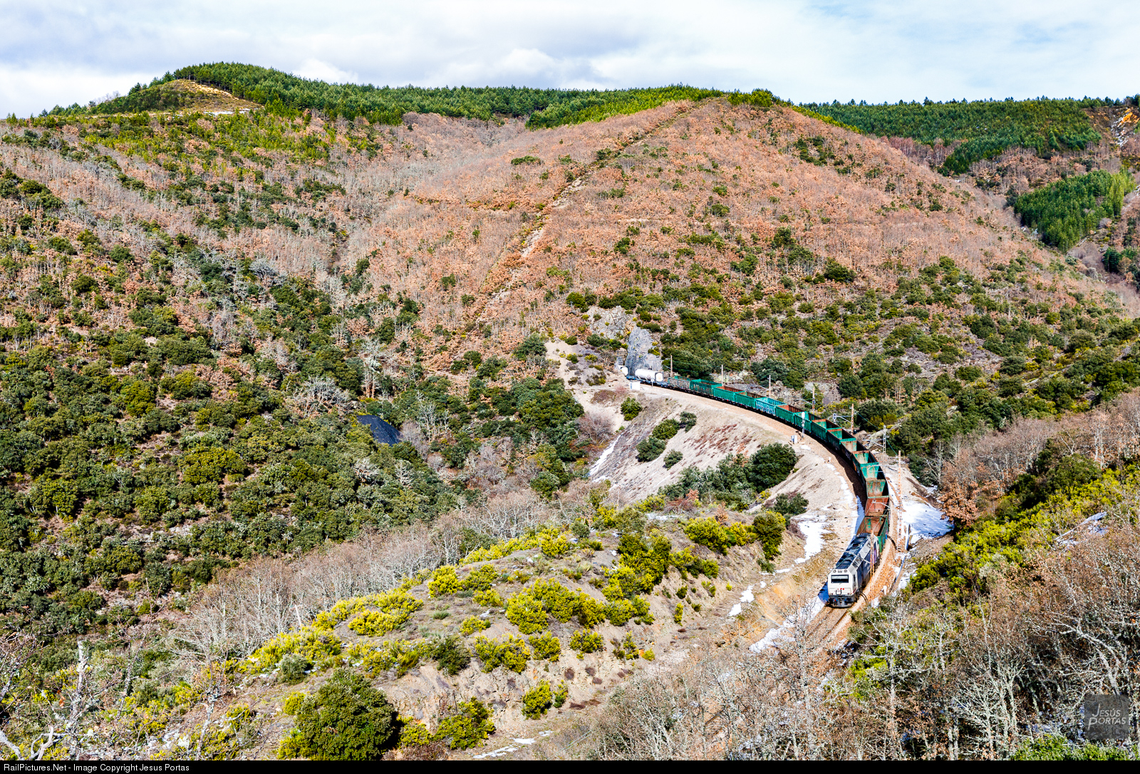 Northbound empty freight passing a section between two of the many tunnels at Manzanal Pass.