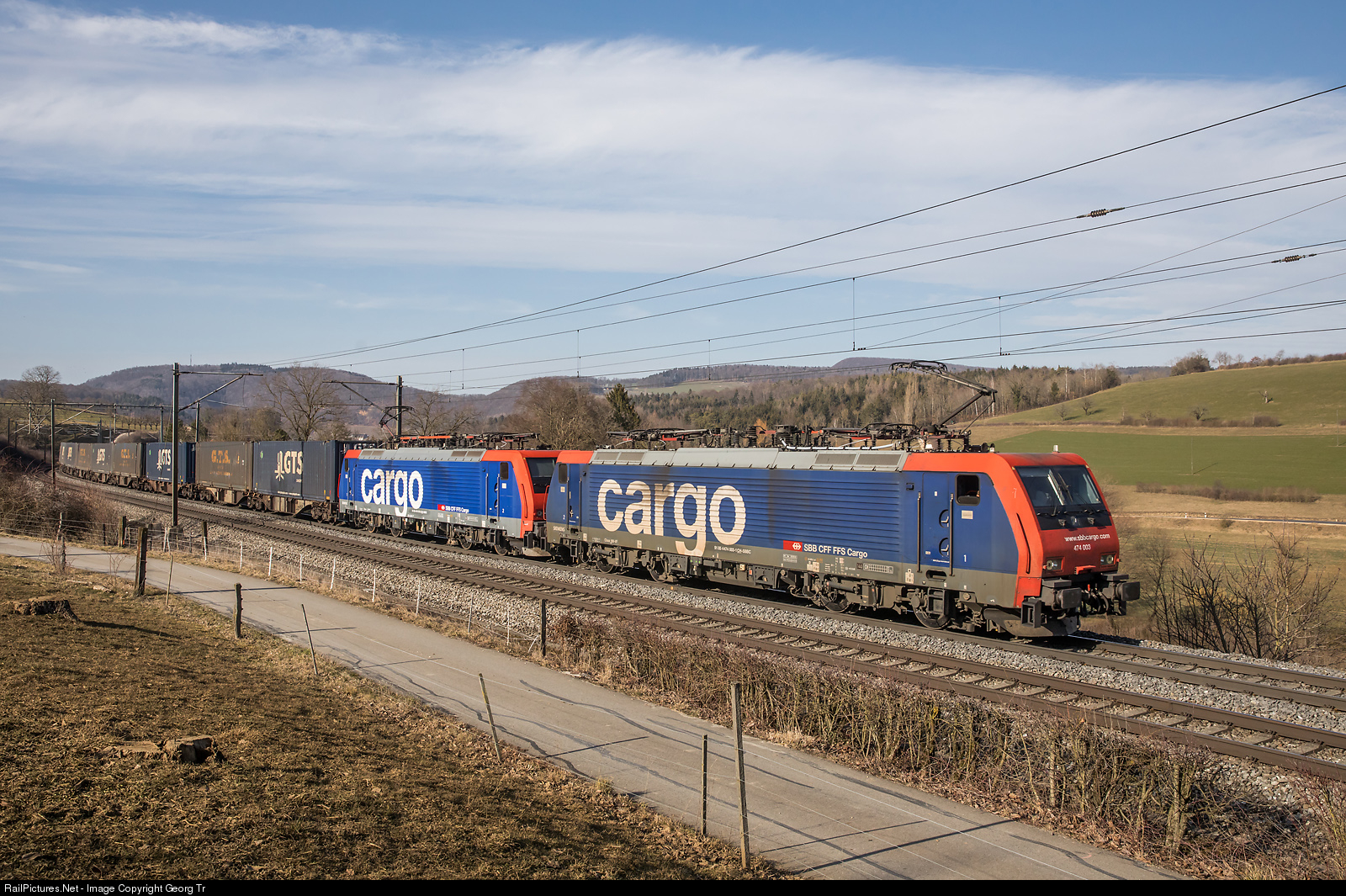| Siemens ES 64-F4 Re 474 # 003 and # 015 of the SBB in multiple traction are pulling southbound intermodal 40119 from Rotterdam-Botlek/Netherlands over the Gotthard line - Chiasso to Milano Smistamento, on the Bözberg north ramp between Hornussen and Effingen. |