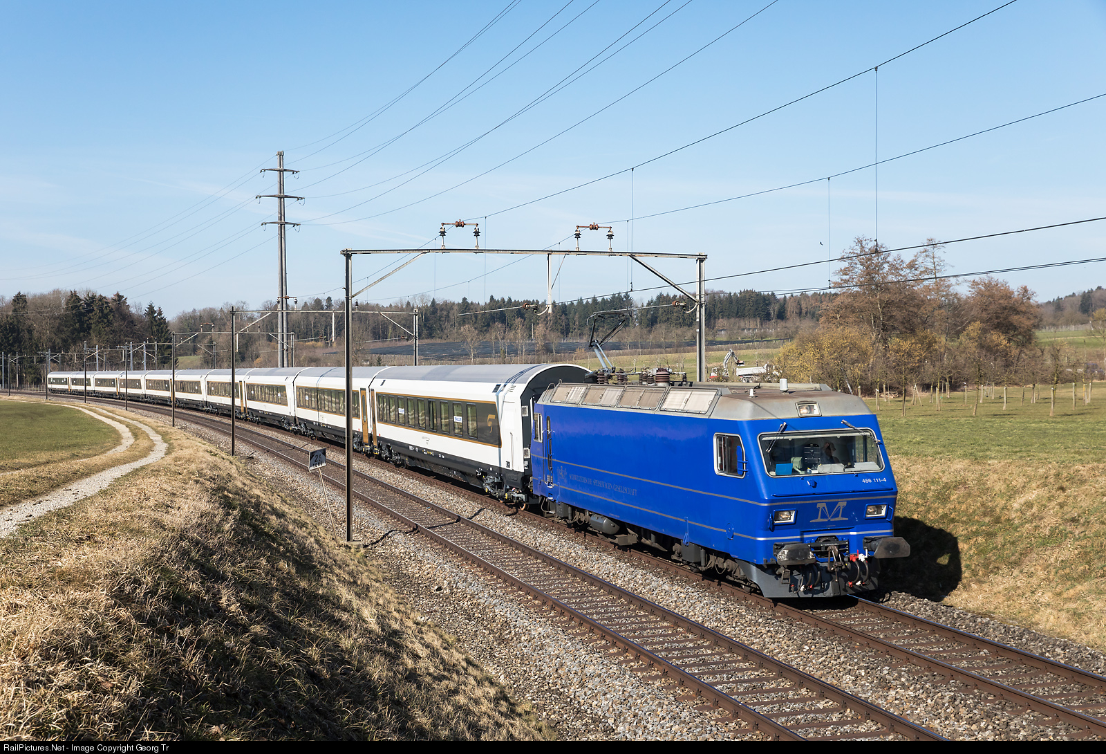 Re 456 # 111 of M-Rail (Müller Rail) in the SSG paint scheme is pulling train 69133 from Weinfelden Süd to Rorschach freight yard between Erlen and Oberaach. The train has 7 sleeping cars of type WLB, 1 dining car WR, 1 sleeping car type WLBb, 1 sleeping car type WLAB and 1 sleeping car type WLA for the Azerbaijan Railways (Azərbaycan Dəmir Yolları) ADY, built by Stadler Rail. The cars have bogies for changeable gauge for Azerbaijan, Russia etc. 1520 and 1435 mm standard.