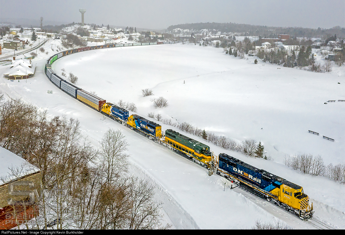 Ontario Northland Railway put together a 4-unit, 4-model, and technically 4-scheme consist on the March 2, Englehart to North Bay, Ontario train 214. Leading the consist is SD75I 2105, heritage-painted SD40-2 1730, GP40-2 2202, and GP38-2 1809, and is seen rounding the frozen Cobalt Lake at Cobalt, Ontario.