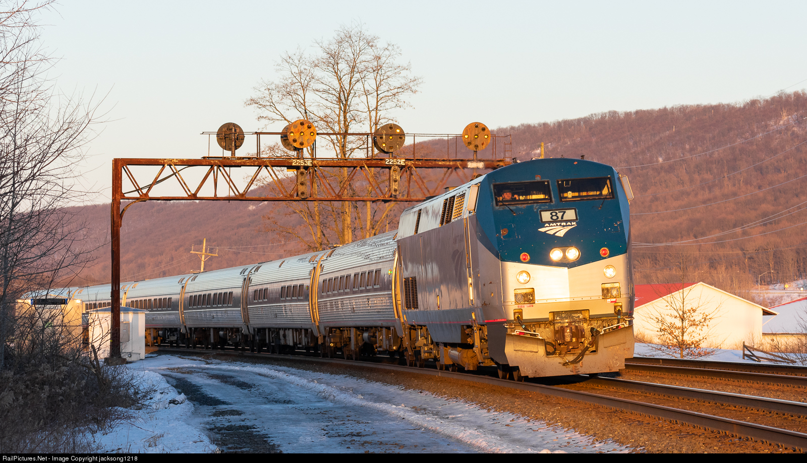 | The Westbound Amtrak "Pennsylvanian" passes under the classic PRR position light signals in Tipton PA. These signals will soon be torn down, making way for new signals that are PTC compatible. |