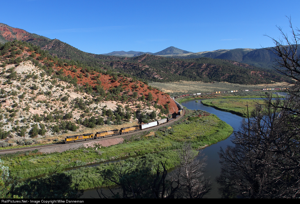 Following the serpentine banks of the Colorado River on Union Pacific’s Moffat Tunnel Subdivision, UP’s MNYRO freight running from Denver to Salt Lake City approaches Yarmony, Colorado, on August, 3, 2014.
