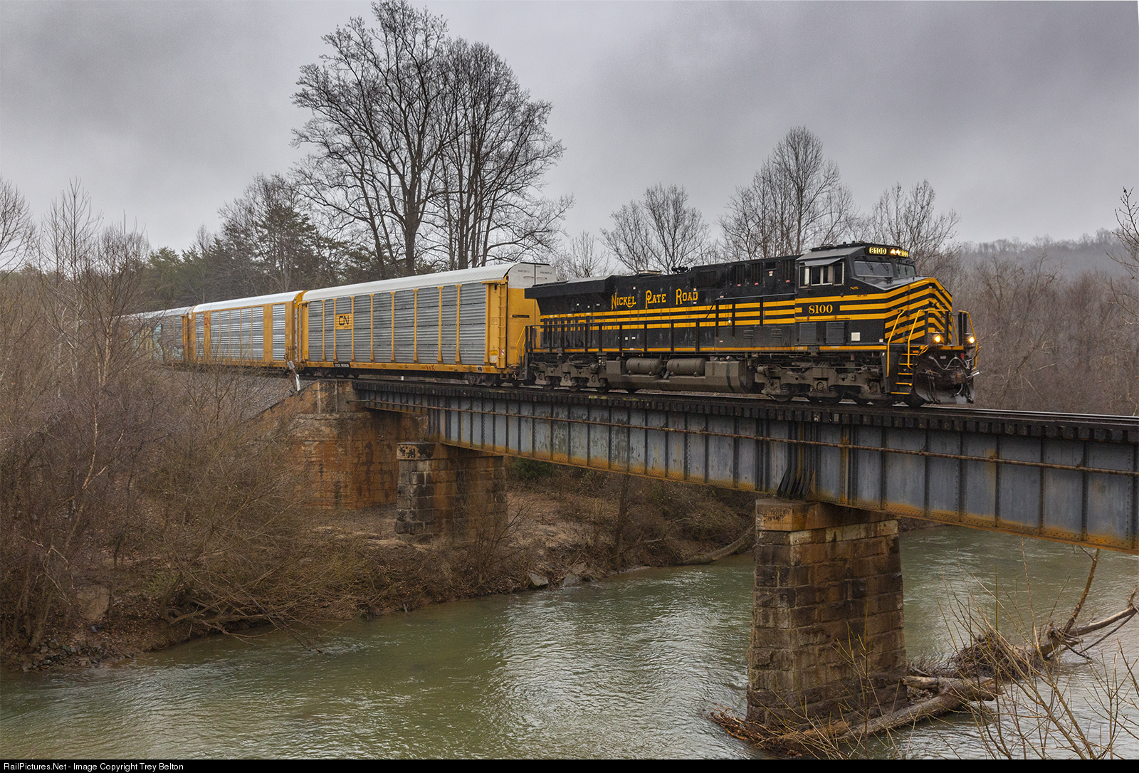 The NS 8100 "Nickel Plate Road" leads the NS 272 autorack train south on the Punkin Vine over the Mayo River.