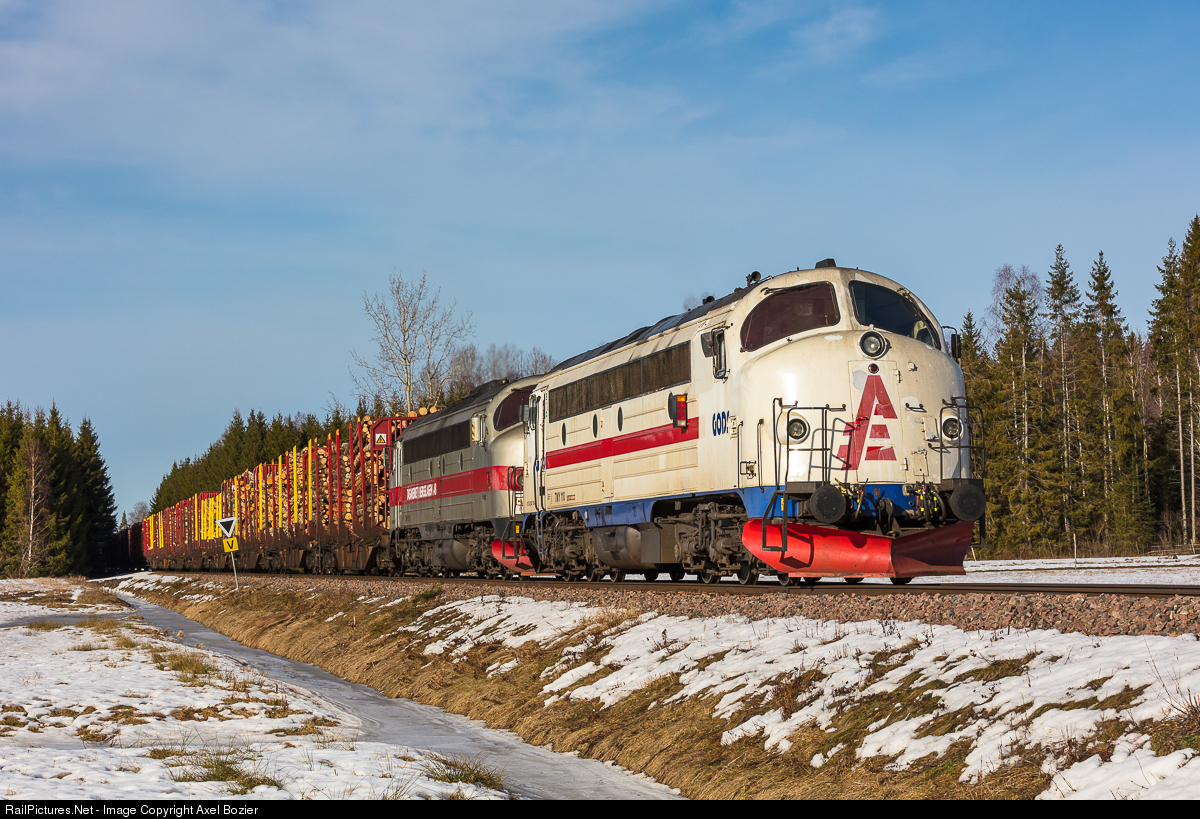 Tågåkeriet i Bergslagen AB (Tågab) NOHAB Diesel locomotives 105 and 110 (ex-DSB MY 1113 and 1132) are pulling a wood log train from Torsby to Grums.