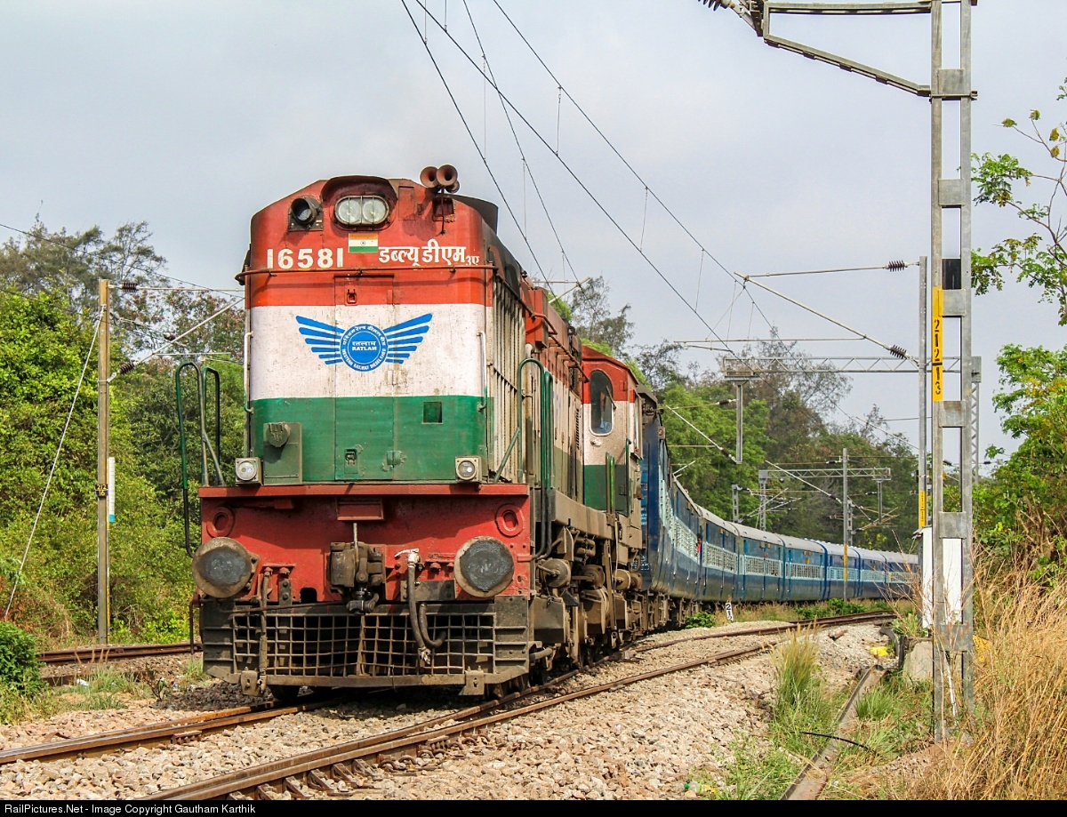As part of Independence day 2018, some locomotives were repainted to the Indian Flag livery. One of the locomotives, WDM-3A #16581 joins the mainline at Kochuveli with express train bound to Bhavnagar terminus. |