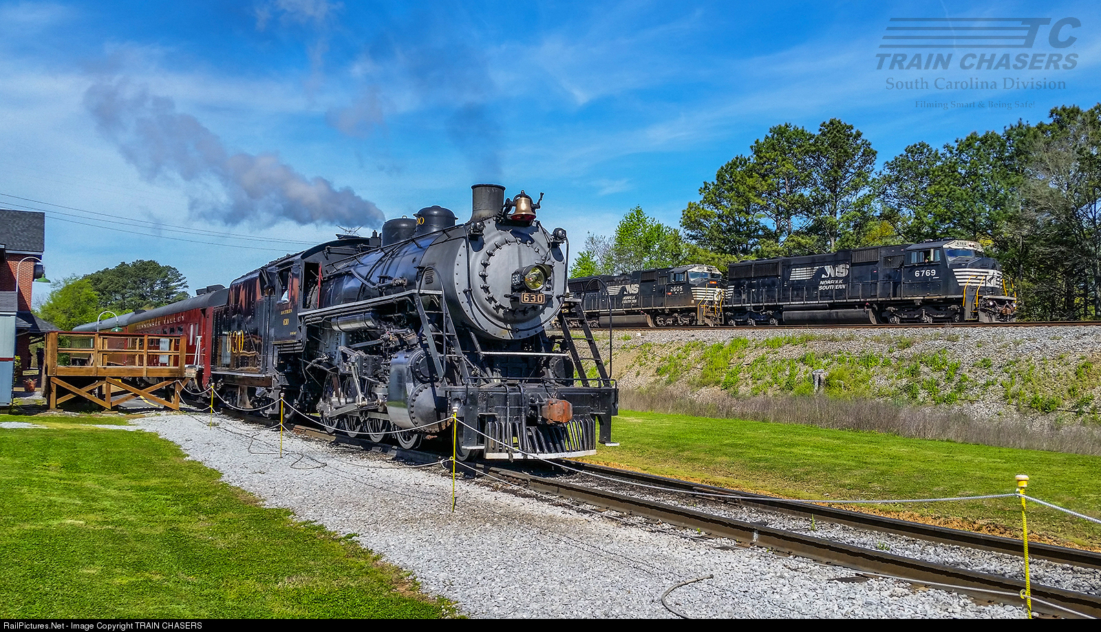 Southern Railway #630 makes a station stop at the TVRM depot with a Norfolk Southern freight train running southbound in Chattanooga, TN.