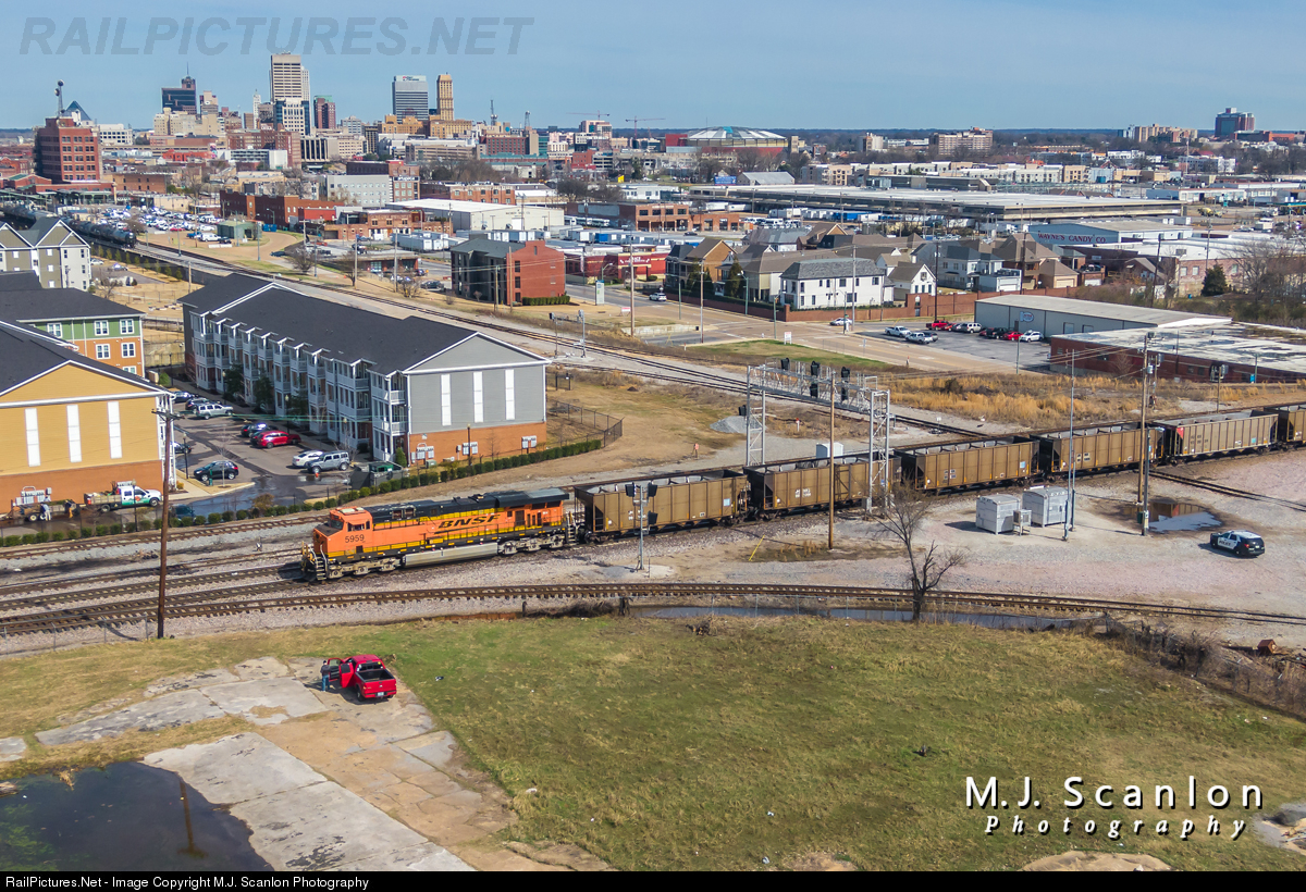 | BNSF 5959 is an engine I've come across before on the Black Hills Sub out west in Campbell, Wyoming. On this day it leads an empty JHMX Miller coal train out of downtown Memphis across CN Junction. The train is making the journey back to the Powder River area of Wyoming for more coal. |
